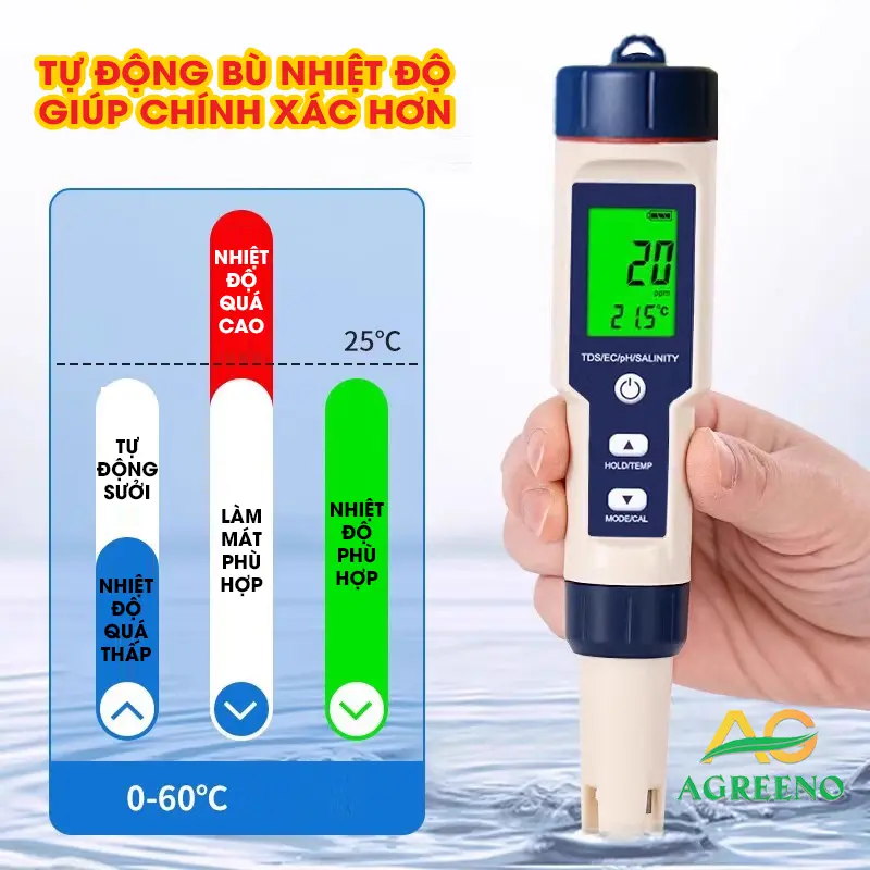 | Nhiệt độ | 0–60°C hoặc 32–140°F (±0.5°C) |