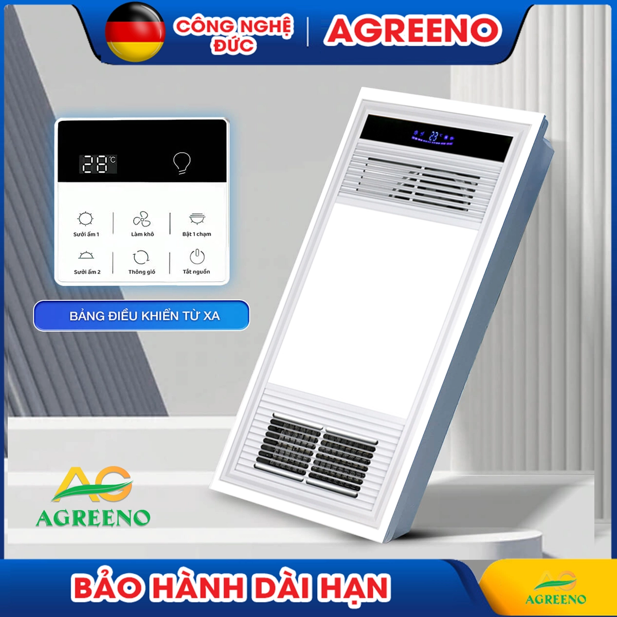 Đội ngũ chăm sóc khách hàng luôn sẵn sàng tư vấnQuạt sưởi phòng tắm thông minh AGREENO 300-AG-1 mang đến sự tiện nghi tối đa cho phòng tắm hiện đại với 6 tính năng trong một sản phẩm. Kích thước 30 x 60 x 10.5cm, công suất tổng 2500W, đèn LED chiếu sáng 20W, quạt máy/thông gió 40W, sưởi ấm 1250W.