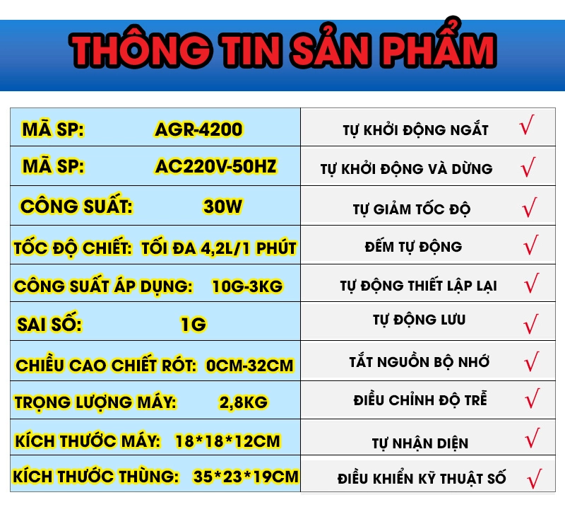 Đội ngũ chăm sóc khách hàng luôn sẵn sàng tư vấnGiới thiệu sản phẩm: Máy chiết rót tự động AGR-4200 là thiết bị lý tưởng dành cho các ngành công nghiệp sản xuất cần độ chính xác cao trong việc chiết rót dung dịch. Với tính năng tự động và điều khiển kỹ thuật số, sản phẩm giúp nâng cao năng suất, giảm thiểu sai sót và tiết kiệm thời gian.