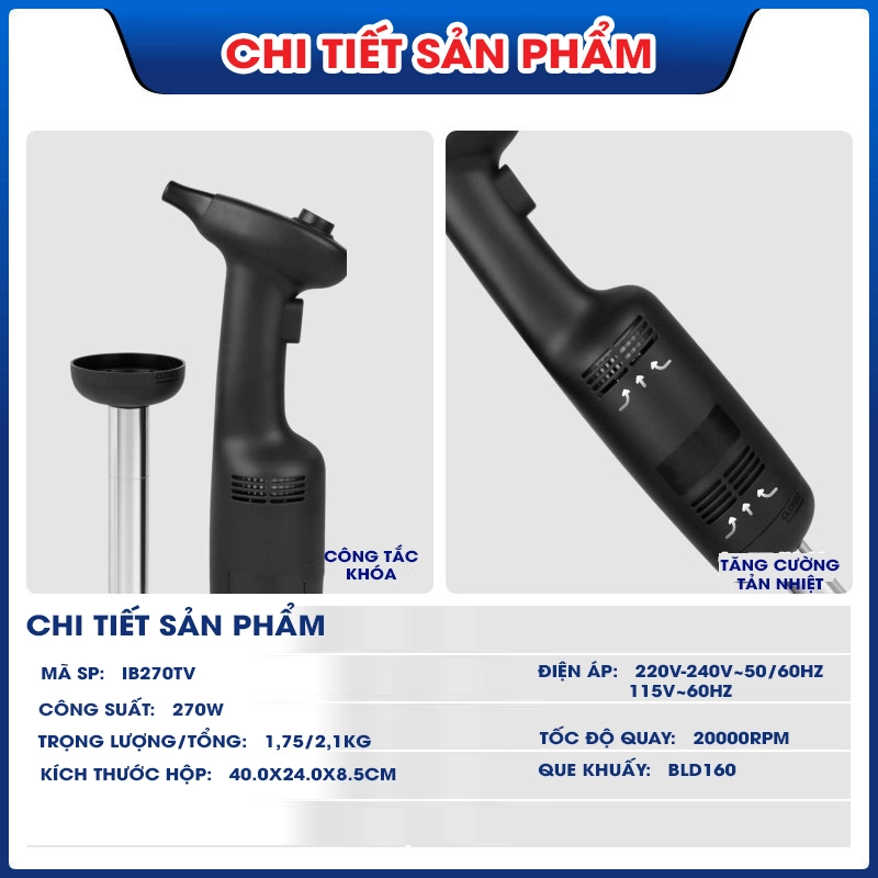 Đội ngũ chăm sóc khách hàng luôn sẵn sàng tư vấnMáy xay cầm tay AGREEN IB270TV là thiết bị nhà bếp tiện lợi giúp bạn dễ dàng xay nhuyễn, trộn và đánh bông thực phẩm chỉ trong vài giây. Với thiết kế hiện đại, động cơ mạnh mẽ và lưỡi dao thép không gỉ cao cấp, sản phẩm mang lại hiệu quả chế biến thực phẩm nhanh chóng, tiết kiệm thời gian nấu nướng.